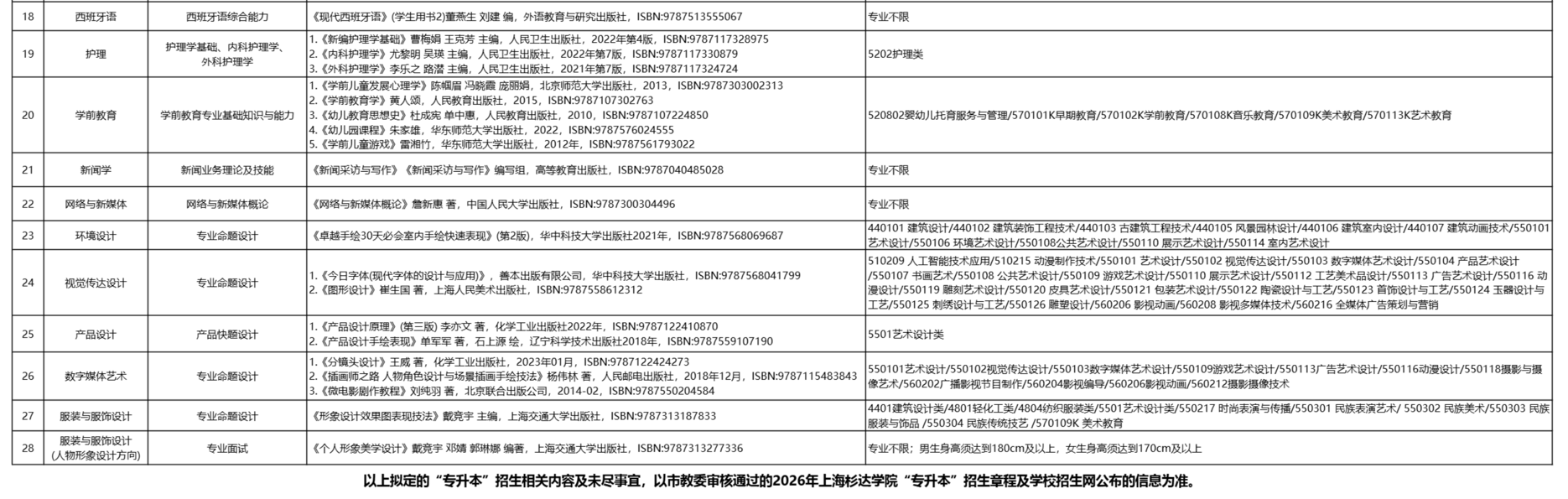 2026年杉达学院“专升本”招生专业、考试科目及对口要求一览表