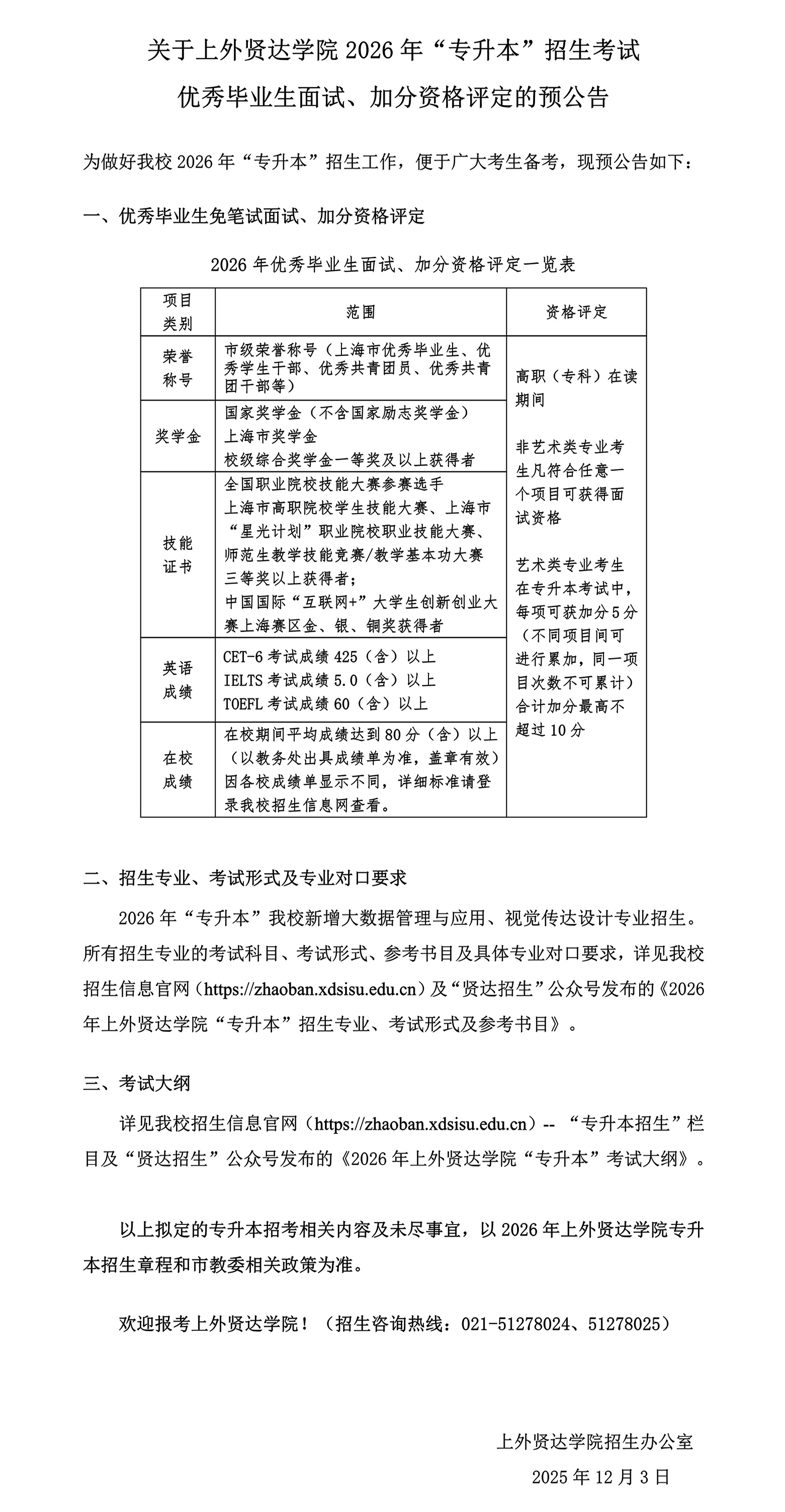 关于上外贤达学院 2026 年“专升本”招生考试优秀毕业生面试、加分资格评定的预公告